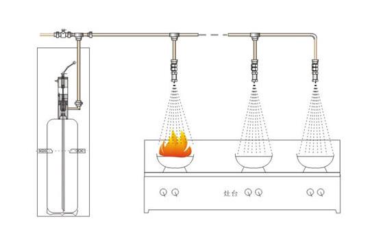 廚房自動滅火裝置是針對廚房火灶而設計研發的新型消防設備,它主要由滅火劑貯存容器、機械控制閥、氮氣瓶、氣筒、應急啟動裝置、燃氣關閉闊、手啟動裝置、減壓器、聲光報警器、煙道噴嘴和灶臺噴嘴所組成。主要根據灶眼個數和煙道長度所設計。